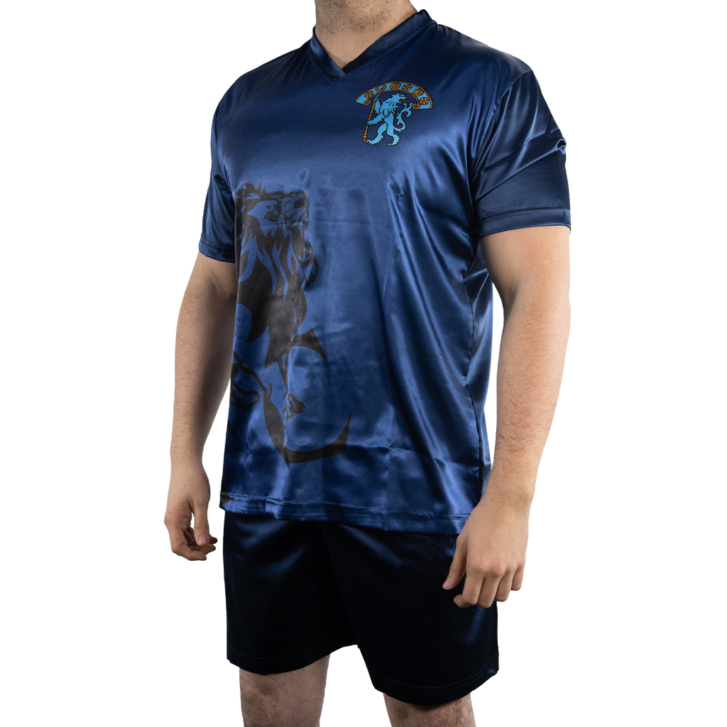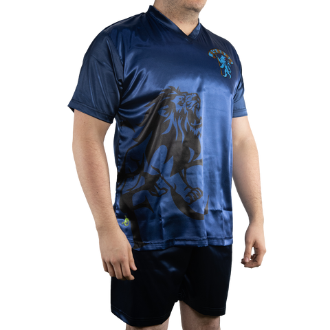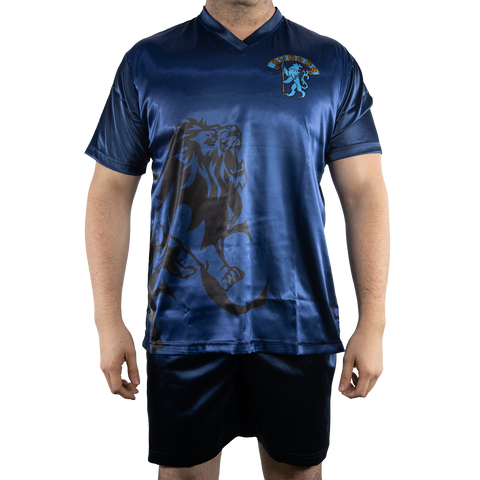 Chelsea's home kit colours are royal blue shirts and shorts with white socks. The club's crest features a ceremonial lion rampant regardant holding a staff.